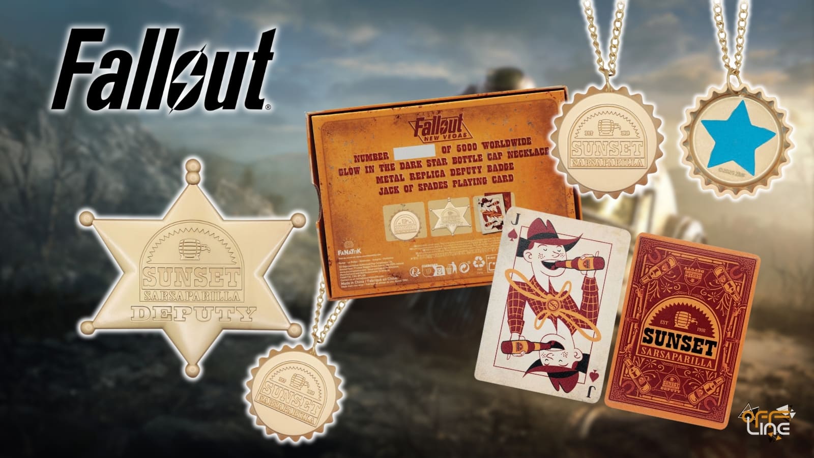 Sada Fallout Sunset Sarsaparilla Legend of the Star tu již byla, ale teď je ve zlatých barvách. Tato limitovaná edice sady Sunset Sarsaparilla Legend of the Star, inspirovaná hrou Fallout New Vegas, obsahuje repliku odznaku zástupce důstojníka, který získáš za splnění úkolu Legend of the Star následovaného úkolem Cenná lekce, dále víčko od lahve Sunset Sarsaparilla v podobě náhrdelníku a eso pikové s vyobrazením Festuse [robota, který vám úkoly zadává].