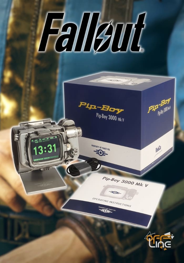 Vyrobeno z kombinace kovu a vstřikovaného ABS plastu. Pip-Boy 3000 Mk V má funkční TFT LCD obrazovku zobrazující animace ze světa hry Fallout [45] a je také funkčním budíkem a hodinami ve stylu hry - ideální pro umístění na tvůj noční stolek s dokonale promyšleným stojanem.