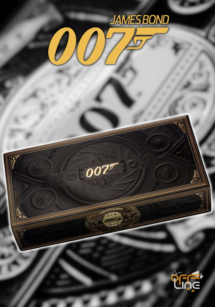 Uvnitř jsou tři balíčky hracích karet Jamese Bonda GOLD Edition.Speciální edice sady funguje jako tajný přístroj navrženým Q na míru pro Jamese Bonda.Otevřením hlavního víka, odhalíš kuličkové pero vyrobené z masivního kusu mosazi s pístem a uzávěrem.Uvnitř pera je kuličková náplň pro snadné psaní.Ale to není vše. Po odhalení tajného mechanismu se tato krabice otevře a odhalí tři VIP balíčky hracích karet 007 ve speciální edici - krabička, design zadní strany a líce každého balíčku jsou zahaleny zlatým designem.